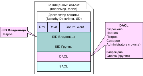 Каждый объект ядра обладает дескриптором защиты (Security Descriptor, SD), который, кроме всего прочего, включает в себя список идентификаторов защиты (Security Identifier, SID), представляющих собой идентификаторы учетных записей, которым разрешен или запрещен доступ к объекту.