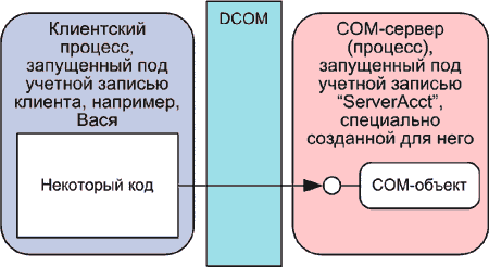 Главное, что нужно понять – по умолчанию метод COM-объекта выполняется под учетной записью серверного процесса. Это очень важный момент! Не осознав его, дальше двигаться нельзя. Представьте себе, в клиентском процессе выполняется некоторый код... этот код выполняется под учетной записью (обычно) имеющей мало прав (по крайней мере на сервере). Код выполняется и в некоторый момент времени доходит до вызова метода удаленного COM-объекта. Управление передается в proxy, та сериализует переданные ей параметры, записывает информацию об учетной записи клиента, устанавливает необходимые параметры защиты и... передает управление DCOM. Тот в свою очередь делает сетевой вызов (с помощью RPC) и передает управление Stub-коду, который восстанавливает полученные данные и вызывает метод COM-объекта. Но (!) код COM-объекта выполняется в контексте защиты сервера, что дает ему (обычно) значительно больше свободы. Сервер выполняет некоторые действия и возвращает управление клиенту. После этого клиент продолжает выполнять свой код в своем контексте защиты. По сути, на время клиент получает права (а вместе с ними и мощь) более привилегированной учетной записи. Но эта мощь ограничена сервисом, предоставляемым сервером. Это очень важный момент, не позволяющий клиенту вмешаться в поведение системы и сделать что-либо нежелательное.