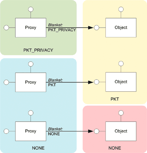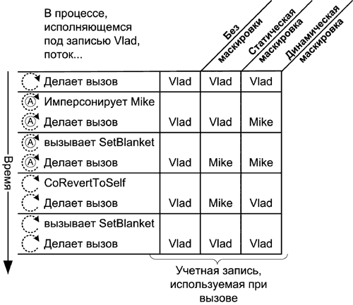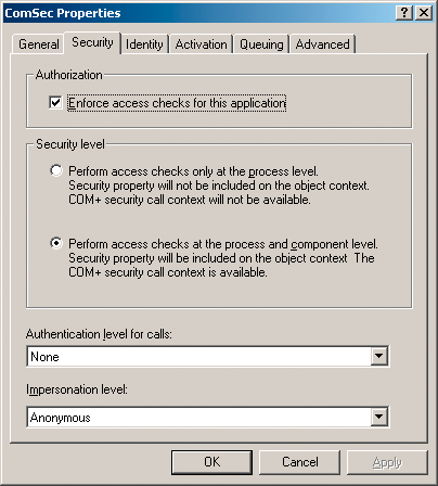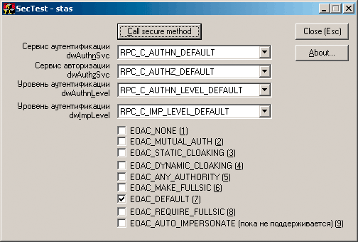 В момент вызова проверяются разнообразные параметры защиты: используемый протокол безопасности, тип имперсонации, тип идентификации и т.п. При этом COM может самостоятельно поднимать уровень этих параметров, если они не удовлетворяют требованиям сервера (о том, как задать данные параметры, будет сказано чуть позже).
