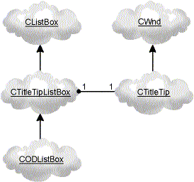 На рис.10 показана диаграмма классов, которая показывает отношения между классами нашего примера. Класс CListBox - это стандартный класс MFC, который инкапсулирует функциональность стандартного элемента управления "список". Класс CTitleTipListBox унаследован от класса CListBox и ответственен за создание и управление подсказками для списка. CTitleTipListBox может использоваться напрямую, если вы реализуете обычный элемент "список". Класс CTitleTip унаследован от CWnd и представляет элемент ToolTip. Класс CODListBox - это элемент "список" с пользовательской отрисовкой, он унаследован от CTitleTipListBox. Для создания элемента "список" с пользовательской отрисовкой нужно унаследовать класс от CTitleTipListBox и переопределить функцию CTitleTipListBox::GetIdealItemRect. Мы обсудим детали реализации CTitleTipListBox::GetIdealItemRect позже.
