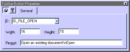 Изменить строки подсказок после генерации приложения просто - найдите панель инструментов в списке ресурсов, откройте двойным щелчком по любой из кнопок на панели диалог свойств кнопки панели инструментов (Toolbar Button Properties) и отредактируйте строку "Prompt" после символа "\n". Например, на рис.2, текстом всплывающей подсказки является "Open". Строка до символа "\n" является текстом, который появляется в строке состояния при наведении на кнопку.