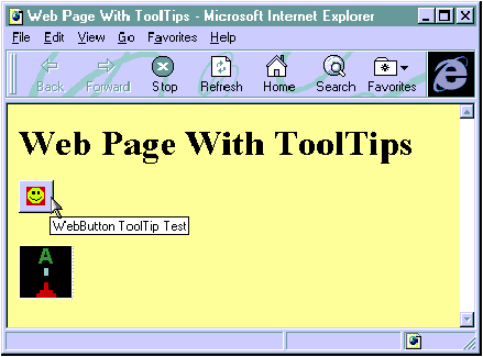Как и в приложениях, подсказки на Web-страницах могут быть очень полезны. Подсказки могут быть использованы в двух очевидных случаях: для картинок и элементов ActiveX. Я написал пример элемента "кнопка", чтобы продемонстрировать, как просто добавлять подсказки к элементам ActiveX. На рис.3 показаны и элемент ActiveX - кнопка с улыбающейся рожицей, и картинка - небольшое "художество" прямо под кнопкой.