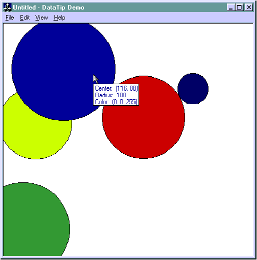 В этом примере я использую новые возможности элементов ToolTip, ставшие доступными с появлением IE 4.0 Common Controls DLL, для создания элементов DataTips, в которых содержится информация о нарисованных кругах (см. рис.6). Я создаю круги различных размеров и цветов в случайных местах окна. Когда курсор мыши находится над кругом, появляется многострочный DataTip, в котором указаны координаты центра, радиус и цвет круга. Цвет подсказки соответствует цвету круга. Многострочные подсказки с возможностью изменения цвета текста в них доступны только при инсталлированном IE 4.0.