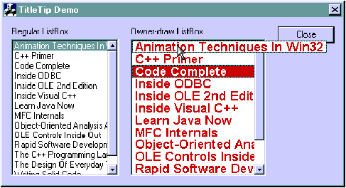 TitleTip - это вид подсказок, которые позволяют полностью увидеть не полностью показанные строки в списковых элементах управления. Например, такие подсказки присутствуют в окне Project Workspace среды разработки Visual C++. Если имя класса не помещается в окно Project Workspace, появляется подсказка, которая показывает нужный текст целиком. Это избавляет пользователя от необходимости горизонтальной прокрутки и увеличении ширины окна. Я написал демо-проект, реализующий TitleTips для элемента управления "список". Однако вы можете использовать сходные приемы для добавления этого вида подсказок и к другим элементам управления. Код, который я написал, может работать как с обычными элементами "список", так и со списками с пользовательской отрисовкой (owner-draw listboxes). Я заполнил оба списка названиями моих любимых книг по программированию (см. рис.9).