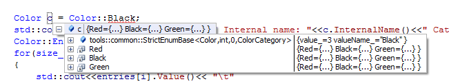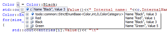DEFINE_STRICT_ENUM_WITH_NAME(Color, int, true, ((Red, 1, "Red")) ((Black, 3, "Black")) ((Green, 5, "Green")) ) DEFINE_STRICT_ENUM_WITH_DESC(Color, int, false, ((Red, 1, "Red color", "Красный")) ((Black, 3, "Black color", "Черный")) ((Green, 5, "Green color", "Зеленый")) ) Color c = Color::Red; std::cout << "Value: " << c.GetValue() << ", Internal name: " << c.InternalName() << ", External name: " << c.ExternalName() << std::endl; Color::Entries entries = Color::GetEntries(); for(size_t i = 0; i < entries.size(); ++i) { std::cout << entries[i].Value() << "\t" << entries[i].InternalName() << "\t" << entries[i].ExternalName() << std::endl; } |