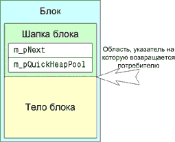 m_pQuickHeapPool – указатель на пул, в котом был выделен блок. Инициализируется перед передачей блока потребителю.