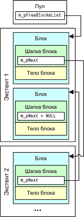 Другой указатель, входящий в заголовок блока, нужен для организации списка освобожденных блоков (см. рисунок 3). Голова списка освобожденных элементов содержится в специальной переменной пула. Когда происходит запрос на выделение нового элемента из пула, пул проверяет, не пуст ли список свободных элементов, и, если он не пуст, выделяет элемент из этого списка. При этом первым элементом списка становится элемент, прикрепленный к выделенному. Если элементов больше нет, то указатель будет указывать на NULL, а блоки будут выделяться из текущего экстента.