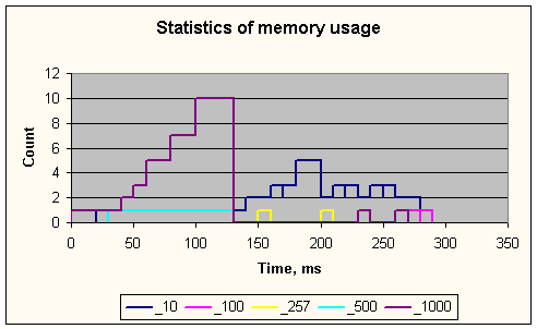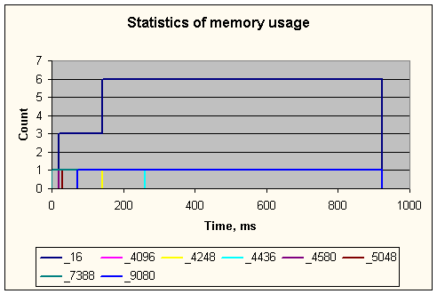 В файле отчета чередуются колонки с временем использования памяти и количеством блоков указанного размера. Чтобы уменьшить объем информации, количество блоков группируется по некоторому (задаваемому) принципу. Речь об этом пойдет ниже. В приведенном выше примере использовалась группировка по интервалам: от 0 до 1-го, от 1-го до 3-х, от 3-х до 6-ти и от 6-ти до 10-ти, причем занимались блоки размером 10, 100, 257, 500 и 1000 байт. Время представляет время нахождения в одном интервале