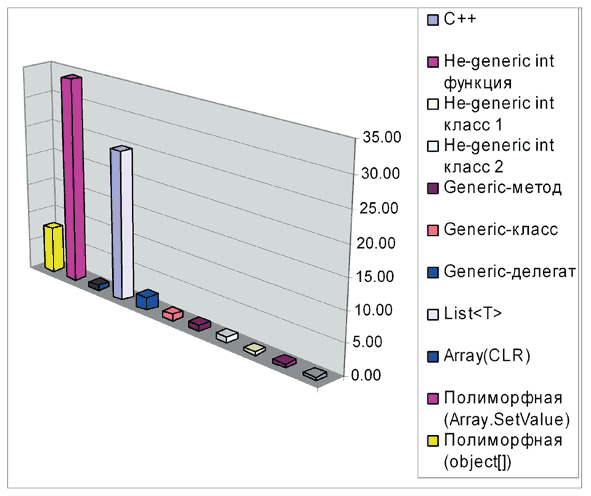 А что же generic-тесты? Тут все зависит от исповедуемой философии. С одной стороны, самый лучший generic-тест оказался приблизительно вдвое медленнее, чем C++-вариант или тест «Не-generic int (функция)». Однако по сравнению с полиморфными такое отставание просто незаметно. Взгляните на график (рисунок 1).