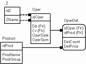 Стало быть, говоря о количественно-суммовом учете (товаре и группе, к которой он относится), мы получаем не атрибуты дебетового или кредитового z-объекта, а атрибуты единицы ресурса (тип и группу). При этом количество товара есть ни что иное, как другое измерение (отличное от денежного). Заметьте, тип товара – это аналитика именно единицы измерения! И не следует причислять ее к дебету или кредиту. Более того, я бы даже посоветовал не хранить ее в проводке. В проводке нужно хранить только сумму в деньгах (полиморфное представление). Количественный учет лучше вынести в отдельную таблицу, содержащую ссылку на проводку (связь "одна проводка ко многим детализирующим записям"). При этом можно будет добавлять несколько количественно-суммовых записей для одной проводки, а проводка будет содержать общую сумму по всем этим записям. Таким образом, проводка будет похожа на простую накладную, что очень хорошо отражает реальную жизнь. Чтобы пояснить мысль, создадим простую реализацию вышесказанного. Назовем таблицу, в которой будут лежать детали проводки, OperDet (детали операции). Номенклатура в этом случае учитывается как ссылка (поле в таблице количественно-суммового учета) на таблицу(ы) справочника номенклатуры. Вот ее описание и описание сопутствующих таблиц: