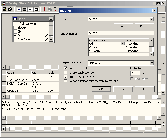 Создавать представление и управлять их индексами удобнее всего из MS SQL Server Enterprise Manager. На рисунке 6 показан момент настройки индексов для индексированного представления.