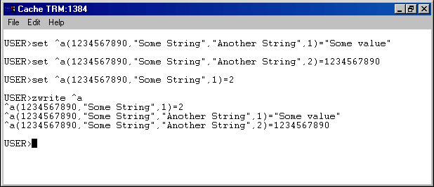 Данные в Cache хранятся в виде разреженных массивов, носящих название глобалей. Количество индексов массива может быть произвольным, что позволяет описывать и хранить структуры данных произвольного уровня сложности. Индексы глобалей могут быть любого литерального типа данных. Например, с помощью следующей глобали можно описать количество машин Mercedes SL600 черного цвета на складе: