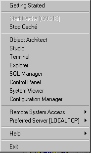 С помощью меню, раскрываемого нажатием правой кнопки мыши на Cache-кубе, можно получить доступ ко всем утилитам СУБД Cache (рис.9).