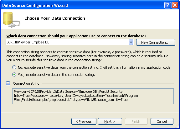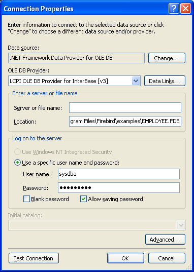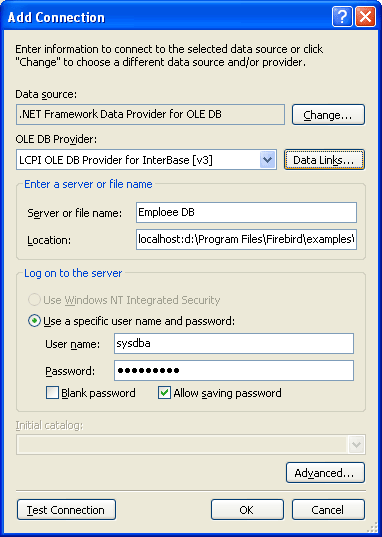 OleDbConnectionStringBuilder cb = new OleDbConnectionStringBuilder(); cb.Provider = "LCPI.IBProvider"; cb.Add("Location", @"localhost:d:\Program Files\Firebird\examples\EMPLOYEE.FDB"); cb.Add("User ID", "sysdba"); cb.Add("Password", "masterkey"); cb.Add("ctype", "win1251"); Console.WriteLine(cb) |