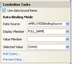 Добавим на форму новый элемент управления DataGridView. Попробуем отобразить в нем список проектов, в которых служащий, выбранный в ComboBox-e, был руководителем. Известно, что таблицы PROJECT и EMPLOYEE связаны между собой через поле TEAM_LEADER по внешнему ключу INTEG_36. Воспользуемся уже знакомым механизмом связи элемента управления и источника данных: