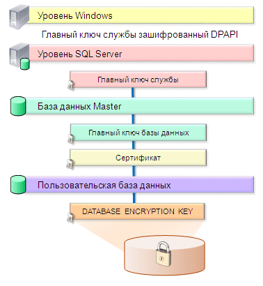 Зашифровать данные, как правило, не составляет никакого труда. Алгоритмы шифрования хорошо известны, и многие из них реализованы в операционной системе (например, AES). Гораздо сложнее придумать, как защитить ключ, которым эти данные зашифрованы. Ведь если мы ”положим” его рядом с зашифрованными данными, то мы получим в лучшем случае обфускацию, но никак не надежную защиту. Для решения этой задачи в SQL Server применяется специальная иерархия ключей. В контексте Transparent Data Encryption (TDE) она строится следующим образом:
