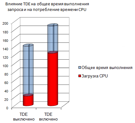 | ПРИМЕЧАНИЕ Влияние TDE на приложения с точки зрения производительности некритично. В исследованиях, где использовались данные и нагрузка от TPC-C тестов, влияние TDE на производительность оказалось в пределах 3-5% и могло бы быть еще меньше, если бы большая часть данных умещалась в оперативной памяти. Шифрование в TDE сильно нагружает процессор, что порождается операциями ввода/вывода. Поэтому серверы с низким уровнем ввода/вывода и низким уровнем потребления CPU будут менее всего страдать от TDE. Напротив, производительность приложений, сильно нагружающих CPU и порождающих большой объем ввода/вывода, будет страдать от TDE заметно сильнее, на уровне 28%. |
