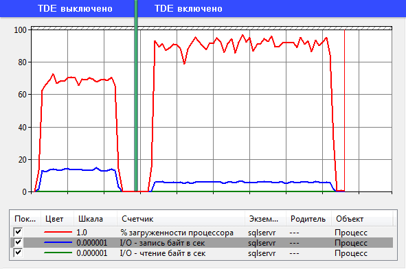И опять запускаем тот же тест. В целях экономии места я не буду повторять листинг тестового запроса. Далее приведен график из Монитора производительности. Для наглядности я совместил результаты с выключенным и включенным TDE на одном графике:
