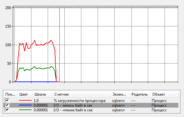 Вот как выглядит наш тестовый запрос в Мониторе производительности (красная кривая характеризует загрузку процессора в процентах, а синяя кривая – запись на диск в МБ/сек):