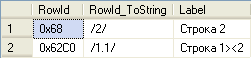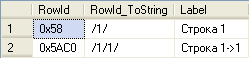 DECLARE @Child_1 HierarchyId SET @Child_1 = @Root.GetDescendant(null, null) DECLARE @Child_1_1 HierarchyId SET @Child_1_1 = @Child_1.GetDescendant(null, null) INSERT dbo.HierarchyTable OUTPUT INSERTED.RowId, INSERTED.RowId.ToString() AS RowId_ToString, INSERTED.Label VALUES (@Child_1, 'Строка 1'), (@Child_1_1, 'Строка 1->1') |