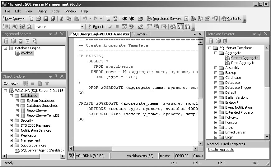 Инструмент SQL Server Management Studio стал еще более близок к среде разработки Visual Studio. Этот программный продукт построен на основе специализированной версии Visual Studio 2005 IDE (Interactive Development Environment). Так же как и его старший брат, SQL Server Management Studio поддерживает создание программных проектов, их отладку и инсталляцию. За счет интеграции с Visual Studio 2005 вы можете использовать этот продукт для создания программного кода на различных языках программирования, входящих в состав .NET Framework. Интеграция с инструментом Visual SourceSafe позволит добиться полного контроля над версиями программных продуктов. Несмотря на интеграцию с Visual Studio 2005, в SQL Server Management Studio вы не сможете компилировать приложения, содержащие вставки кода на языках C#, J# или VB.NET. Вам необходимо использовать для этих целей Visual Studio 2005. SQL Server Management Studio позволяет создавать приложения с использованием технологий MX, MDX, T-SQL и XMLA.