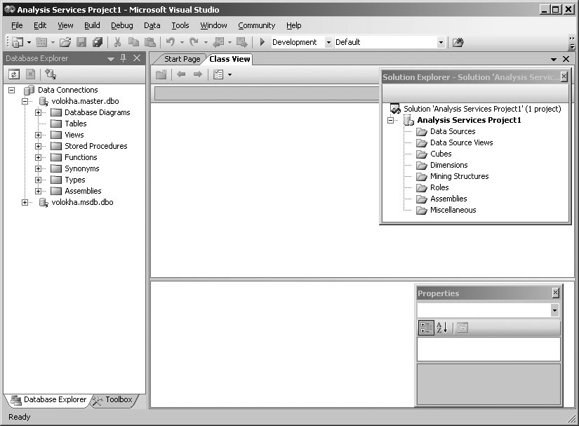 Утилита Business Intelligence Development Studio имеет свое собственное окно Solution Explorer, которое выполняет функции, аналогичные функциям своего собрата в SQL Server Development Studio. Расположение данного окна аналогично его положению в окне SQL Server Development Studio: оно находится в правом верхнем углу (см. рис. 3.5). Окно Solution Explorer содержит иерархическую структуру файлов проекта. Корень дерева представляет собой наименование решения, далее идут проекты и заканчивается структура отдельными файлами, которые принадлежат либо отдельным проектам, либо всему решению. С помощью Business Intelligence Development Studio можно создавать проекты следующих типов: