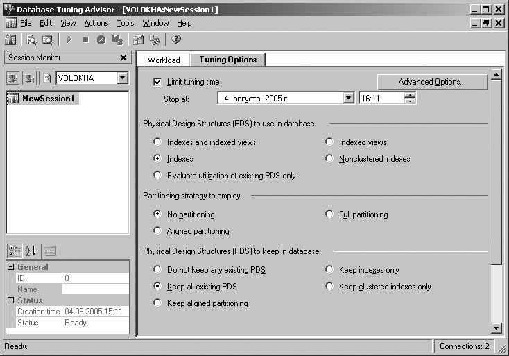 Теперь утилита Database Tuning Advisor представляет собой полноценное приложение, а не набор разнородных инструментов и диалогов, как это было с Index Tuning Wizard. Общий вид окна Database Tuning Advisor приведен на рис. 3.8.