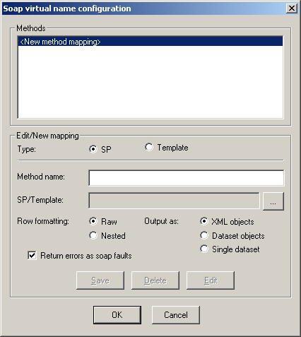 Здесь имя виртуальной директории – «srv». Имя Web-сервиса – webserv, тип директории – soap, имя хоста – dcit06. Кроме этого, необходимо указать физический путь до папки, где будут располагаться конфигурационный файл и файл описания Web-сервиса. После того, как вы нажмете кнопку «Save», SQLXML создаст wsdl-файл, в котором будет содержаться описание Web-сервиса, и конфигурационный файл ssc, в котором будут содержаться описания всех Web-методов и их параметров. Файл ssc предназначен только для внутренних служебных нужд SQLXML, его формат нигде не описан и в любой момент может измениться.