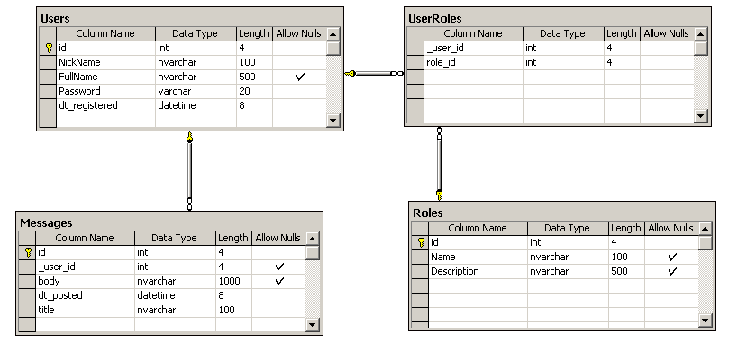 Начнем с проектирования структуры базы данных. В приложении будут участвовать объекты: пользователи, роли пользователей и сообщения. Связь между пользователями и ролями – «многие ко многим», а между сообщениями и пользователями – «многие к одному». К атрибутам пользователя относятся: имя, полное имя, дата регистрации и пароль. Имя пользователя и пароль должны быть уникальными. Кроме этого, ни пароль, ни имя не должны допускать пустых строк. К атрибутам сообщения относятся: дата создания сообщения, тело сообщения и заголовок сообщения. Диаграмма таблиц представлена на рисунке 4.