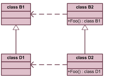 Эта возможность (которая поддерживается в C++, Java, D и других языках) полностью согласуется с принципами проектирования по контракту и, в частности, с принципом усиления постусловия, поскольку можно считать, что для типов D1 и B1 выполняется соотношение typeof(D1) < typeof(B1).