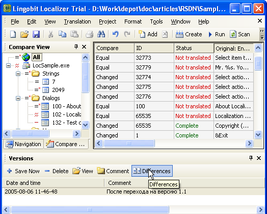 Допустим, что когда мы выпустили перевод и разослали дистрибутивы на множестве языков по всему миру, разработчики решили немного изменить интерфейс приложения, и теперь необходимо обновить переводы на все языки. Это была бы огромная по трудоемкости задача, если бы не Scan for Changes. Эта функция производит сопоставление новой версии приложения с предыдущей (переведенной), в зависимости от соответствия выставляет статусы для каждого из элементов и переносит переводы в новую версию. Механизм действует по следующему принципу: если элемент не изменился, статус останется прежним, и перевод будет сохранен полностью. В случае, когда можно провести только приблизительное соответствие, элемент получит статус «Updated», и тоже сохраняет свой перевод, но впоследствии такие элементы надо будет перепроверить. Переводы элементов, для которых не было найдено соответствия, будут удалены, а новые элементы, которые появились только в последней версии, получат статус «New».