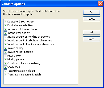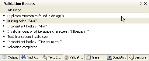 Теперь, когда перевод ресурсов закончен, настало время проверить корректность перевода. Конечно же, можно посадить за это дело тестера и попросить его перепроверить всю программу, но многие из ошибок можно заметить, даже не запуская приложение. Например, легко забыть пробел в конце или начале перевода, если он был в оригинале, или указать одинаковые мнемоники в меню или даже обнаружить строки, выходящие за граница элемента диалога. Чтобы отыскать подобные ошибки, можно использовать механизм Validation. Он предоставляет обширный набор проверок, что позволяет выявить большинство стандартных ошибок переводчика, понимание которых чуждо нетехническому разуму. Итак, проверим проект.