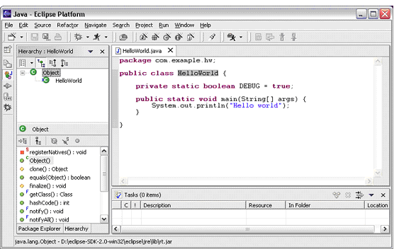 Проект Eclipse включает в себя платформу для разработки приложений, IDE для Java, построенную на ее основе а также средства, необходимые разработчику приложений. Дистрибутив, объединяющий эти компоненты вместе с исходными кодами и пользовательской документацией, называются Eclipse SDK – именно с него рекомендуется начинать знакомство с Eclipse. Eclipse SDK содержит все необходимое для разрабочиков Java: инкрементальный компилятор, редактор Java с подсветкой синтаксиса, контекстным автозавершением и поддержкой шаблонов, отладчик, поддержку автоматического рефакторинга и навигации по исходному коду. Для работы Eclipse SDK необходима JRE (Java runtime environment) версии не ниже 1.4.1 и операционная система Windows 98/ME/2000/XP, Linux, Solaris, AIX, HP-UX или Mac OSX.