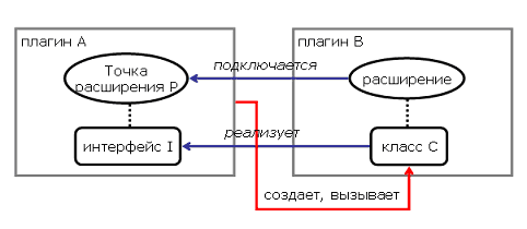 Клиенты точки расширения P (они не обязательно должны находится в плагине A, объявляющем точку расширения) могут получить список обнаруженных расширений P (в этом примере – единственное расширение в плагине B), создать их экземпляры и работать с ними через общий интерфейс I, объявленный в том же плагине, что и точка расширения.