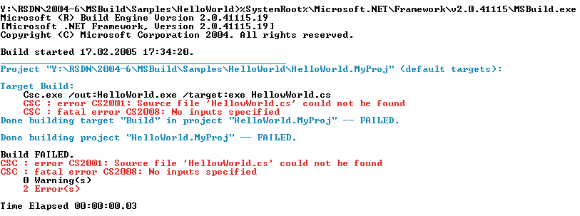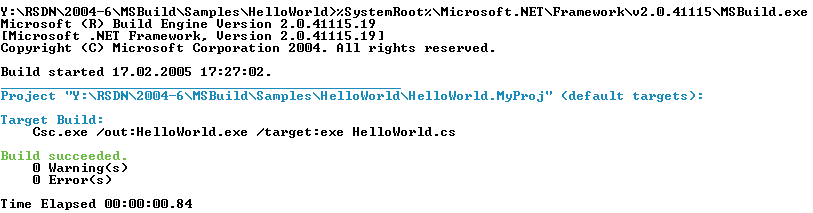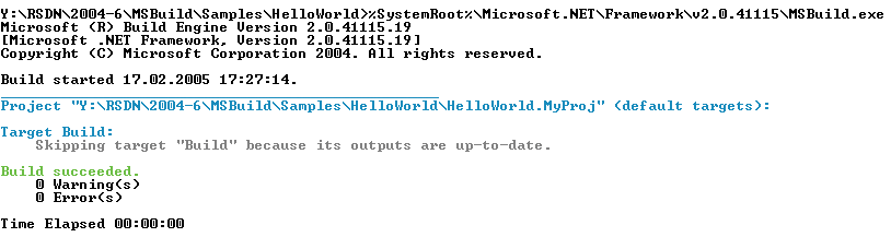 Атрибут xmlns задает пространство имен, по которому MSBuild определяет версию формата файла проекта. Если задать какое-либо другое пространство имен, или не указать сообщение вовсе, MSBuild выдаст сообщение об ошибке «Y:\RSDN\2004-6\MSBuild\Samples\HеlloWorld\HеlloWorld.proj(1,1): error MSB4041: The default XML namespace of the project must be the MSBuild XML namespace. If the project is authored in the MSBuild 2003 format, please add xmlns="http://schemas.microsoft.com/developer/msbuild/2003" to the <Project> element. If the project has been authored in the old 1.0 or 1.2 format, please convert it to MSBuild 2003 format.».
