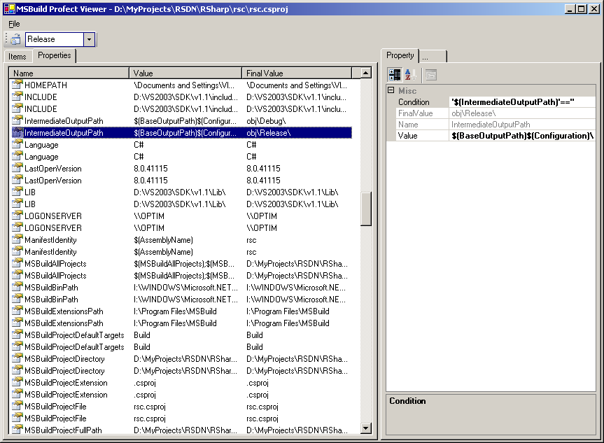 Рисунок 8. MSBuilgApiTest – список свойств в конфигурации «Release».