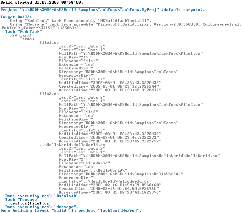 <Project DefaultTargets="Build" xmlns="http://schemas.microsoft.com/developer/msbuild/2003"> <ItemGroup> <MyItems Include="**\*.cs;..\HelloWorld\*.cs"> <Test1>Test Data 1</Test1> <Test2>Test Data 2</Test2> </MyItems> </ItemGroup> <UsingTask TaskName="Rsdn.Build.Tasks.RsdnTask" AssemblyFile="MSBuildTaskTest.dll"/> <Target Name="Build"> <RsdnTask Items="@(MyItems)"> <Output ItemName="ResultingItems" TaskParameter="Items" /> </RsdnTask> <Message Importance="High" Text="@(ResultingItems)" /> </Target> </Project> |