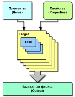 Принцип работы MSBuild очень прост. С помощью элементов и свойств определяются, скажем так, данные проекта. Для выполнения таких действий над проектом, как сборка (Build), очистка (Clean), пересборка (Rebuild), вызываются цель (Target). Цели производят некие действия путем вызова задач (Task). Эти действия изменяют дату или состав файлов, и порождают выходные файлы (output). Выполнение целей не обязано быть безусловным. Оно может зависеть от того, были ли изменены элементы (вернее, ассоциированные с ними файлы). Например, такая проверка производится перед сборкой проекта.