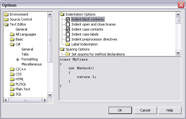 Самое приятное, что все можно настроить по-своему. Это делается в соответствующей ветке диалога настроек (см. рисунок 2). Что особенно приятно, практически для всех настроек приводятся демонстрационные примеры, отображаемые в окне под списком настроек. Все настройки форматирования помещаются в профайл пользователя, так что их без труда можно распространить по всему предприятию.