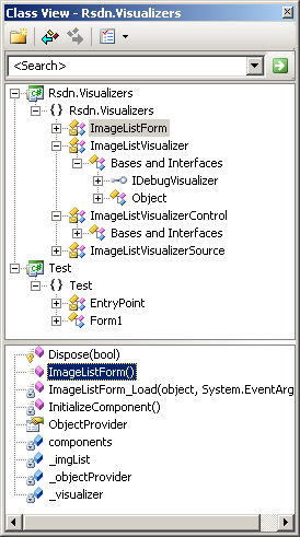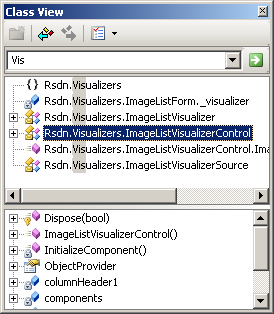 Чтобы лучше разобраться в вопросе, как и с чем едят визуализаторы, я создал визуализатор для объектов класса System.Windows.Forms.ImageList. Этот визуализатор выводит диалог, содержащий элемент управления ListView, в который добавляются элементы, соответствующие картинкам ImageList-а. Названия элементов формируются из их порядкового номера и ключа (если таковой задан).