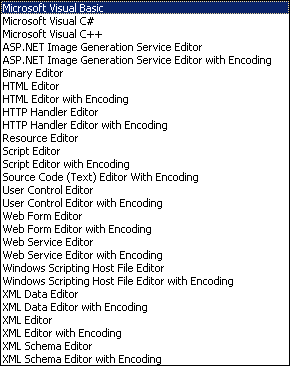 Список поддерживаемых по умолчанию (в поставке VS 2005) редакторов и дизайнеров представлен на рисунке 4.