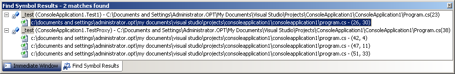 Совершая двойные щелчки по этим вхождениям можно переходить к соответствующим местам в файлах (или переходить в Object Browser, если исходный код отсутствует).