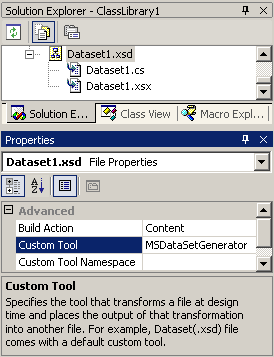Одним из интересных механизмов, добавленных в VS.NET, и объявленным вторым по крутизне в статье “Top 10 Cool Features of VS.NET” в октябрьском выпуске MSDN Magazine за 2002 год, была возможность обрабатывать исходные файлы генератором и создавать новые файлы, которые будут включены в тот же проект. Microsoft использовала этот механизм для создания исходного кода типизированых датасетов по XSD и в Web-сервисах. Crystal Reports, генератор отчетов, поставляемый с VS.NET, использует тот же механизм для обработки своих файлов.