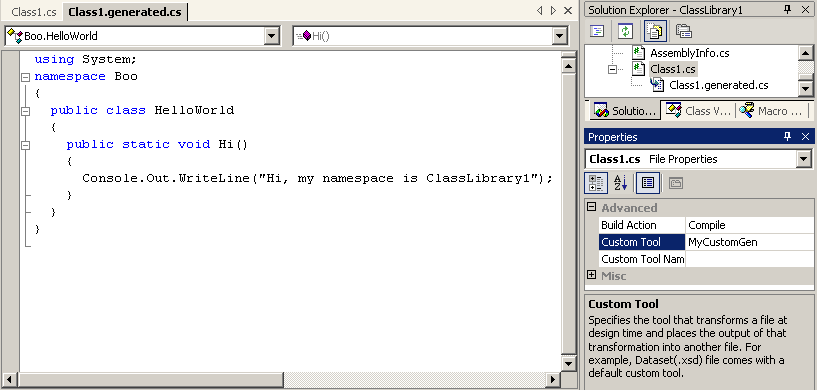 В открывшейся Visual Studio создадим новый проект C# - например, Class Library. В свойствах файла Class1.cs установим “Custom Tool” в “MyCustomGen” и “Custom Tool Namespace” в “Something”.