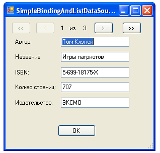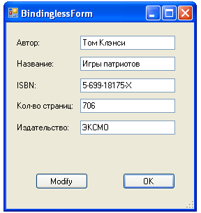 Ну что же, благодаря нововведениям C# 3.0 мы смогли сэкономить немало строк кода и в результате получили работоспособное приложение, которое осуществляет двустороннюю «привязку» данных объекта BookInfo к элементам управления. Такой поход применялся длительное время в огромном количестве приложений и, как это ни странно, по сей день активно используется в приложениях Windows Forms.