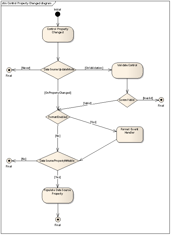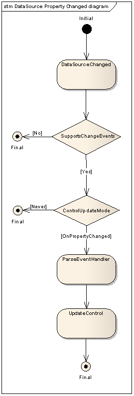 Идея достаточно проста. Нужно получить PropertyDescriptor для свойства источника данных и элемента управления. Подписаться на событие изменение этих свойств и в обработчике этих событий изменять соответствующее свойство противоположной стороны.