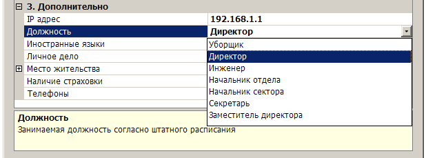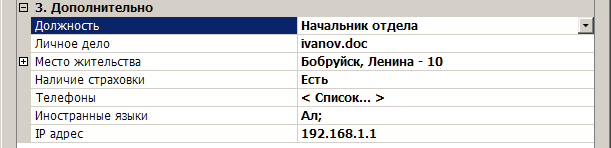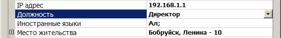 [DisplayName("Место жительства")] [Description("Адрес")] [PropertyOrder(30)] [Category("3. Дополнительно")] public AddressData Address ... [DisplayName("Наличие страховки")] [Description("Наличие страховки")] [PropertyOrder(40)] [Category("3. Дополнительно")] [TypeConverter(typeof(BooleanTypeConverter))] publicbool Insurance ... [DisplayName("Телефоны")] [Description("Список номеров телефонов")] [PropertyOrder(50)] [Category("3. Дополнительно")] [TypeConverter(typeof(CollectionTypeConverter))] [Editor(typeof(PhoneNumbersCollectionEditor), typeof(UITypeEditor))] public List<PhoneNumber> Phones ... [DisplayName("Личное дело")] [Description("Имя файла личного дела")] [Category("3. Дополнительно")] [PropertyOrder(20)] [Editor(typeof(DocFileEditor), typeof(UITypeEditor))] [DynamicPropertyFilter("Post", "Уборщик, Инженер, Начальник отдела, Начальник сектора, Секретарь")] publicstring PersonalFileName ... [DisplayName("IP-адрес")] [Description("IP-адрес компьютера рабочего места")] [PropertyOrder(70)] [Category("3. Дополнительно")] [Editor(typeof(IPAddressEditor), typeof(UITypeEditor))] public IPAddress IPaddress ... [DisplayName("Иностранные языки")] [Description("Какими иностранными языками владеет")] [PropertyOrder(60)] [Category("3. Дополнительно")] [Editor(typeof(ForeignLangsDropDownEditor), typeof(UITypeEditor))] public ForeignLangs Foreignlangs ... [DisplayName("Должность")] [Description("Занимаемая должность согласно штатного расписания")] [Category("3. Дополнительно")] [PropertyOrder(10)] [TypeConverter(typeof(PostTypeConverter))] publicstring Post ... |