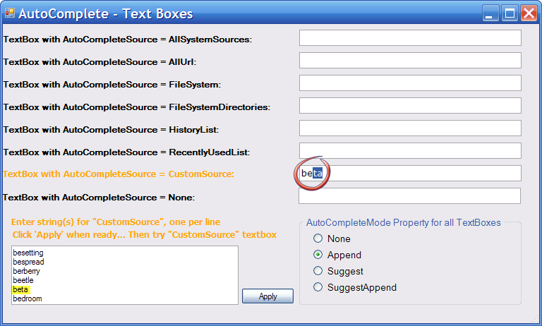 Демо-пример данного раздела запускается кнопкой "Textboxes and automatic completion" в главной форме. В новой форме представлено восемь TextBox-ов (по числу значений AutoCompleteSource, за вычетом ListItems – он для TextBox-а не годится) и один многострочный TextBox для "игр" с вариантом CustomSource – он служит "инкубатором" для возможных вариантов автозавершения. Радиокнопки позволяют посмотреть варианты работы свойства AutoCompleteMode, причем это свойство переключается сразу для всех восьми тестируемых TextBox-ов: