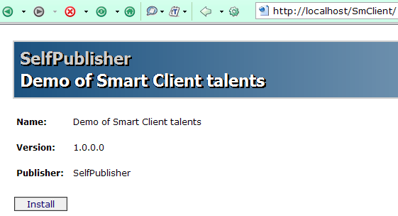 | setup.exe | Установщик необходимых компонентов из списка “Prerequisites…” опций проекта. Если при щелчке по кнопке “Install” (см. ниже) в браузере система замечает, что на целевом компьютере отсутствует один из требуемых компонентов, то запускается именно этот файл, который и проводит пользователя по тернистому пути установки всяческих недостающих компонентов. В противном случае ссылка кнопки “Install” ведет прямо на файл <база>\SmartClient.application и данный setup.exe попросту не используется. |