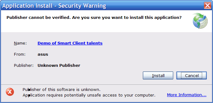 На открывшейся страничке с краткой информацией о приложении имеется кнопка “Install”. Нажатие на нее запускает установку приложения. Поскольку на моей машине все необходимые компоненты установлены, установлены, запускается не файл setup.exe, а непосредственно SmartClient.application. Действительно, сразу по нажатию система стартует новый процесс dfsvc.exe (Distributed Files SerViCe?), который и является тем самым движком технологии ClickOnce - любое ClickOnce-приложение никогда не запускается напрямую. Впрочем, к движку я еще вернусь, а пока отмечу, что запускаемый файл этого процесса размещается по пути C:\WINDOWS\Microsoft.NET\Framework\v2.0.50215\dfsvc.exe для той версии beta2, что установлена на моей машине. Этот же факт отвечает на вопрос “является ли ClickOnce частью Framework и необходимо ли второе для работы первого?” Ответ на обе части вопроса – категорическое да. Разумеется, только ClickOnce-движок знает как разбирать манифест развертывания и какие шаги предпринимать в зависимости от его содержимого. В данном случае он выдает запрос на локальную установку приложения: